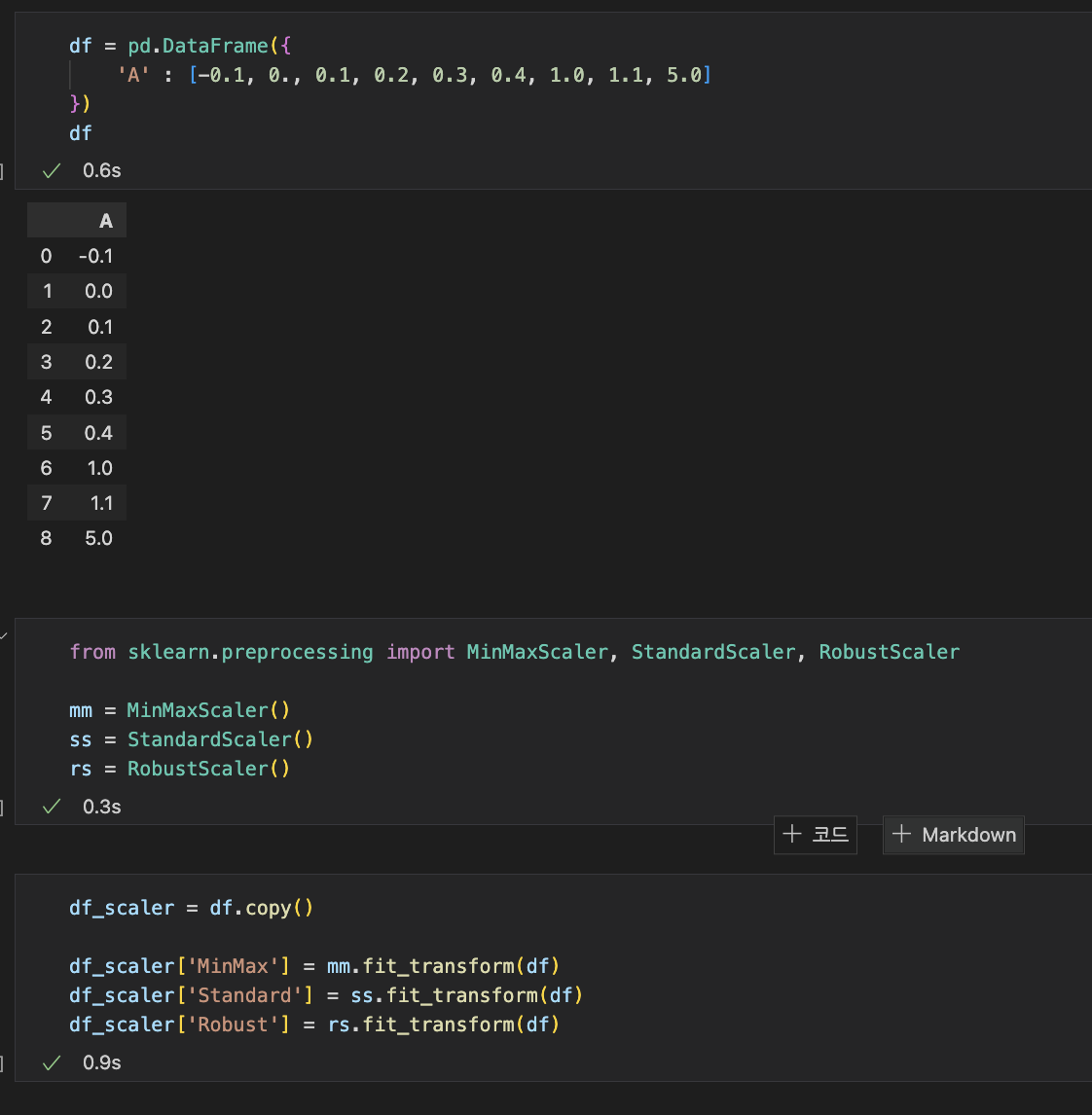 새로운 dataFrame을 만들어주는데, 위에서 만든 scaler들과 함께 비교하며 보기 위해 각각을 fit_transform 해준다.