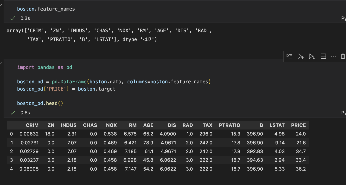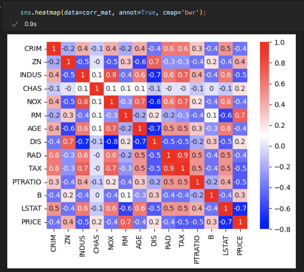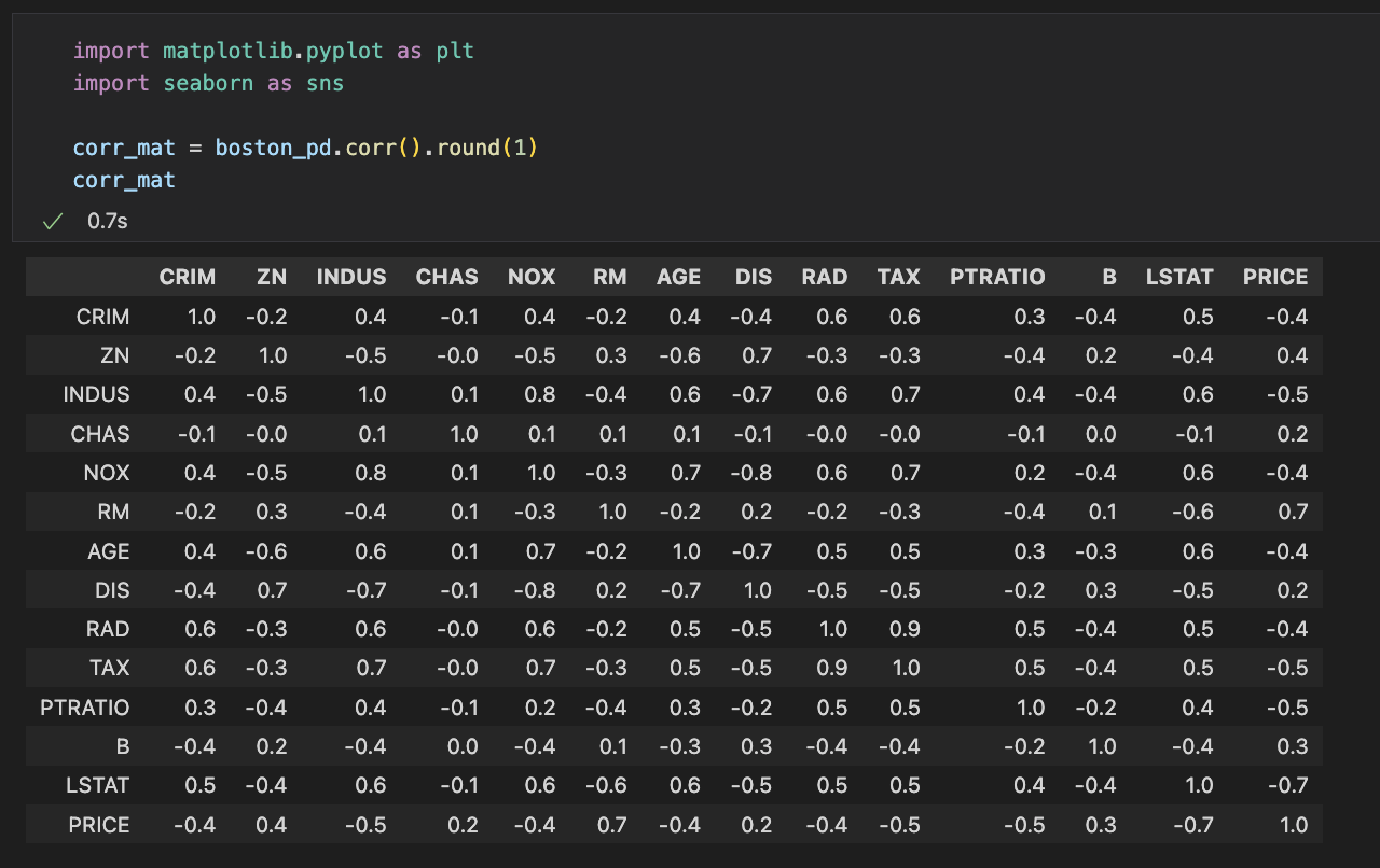 Price와 RM(방의 수), LSTAT(저소득층 인구)가 높은 상관관계를 보인다.