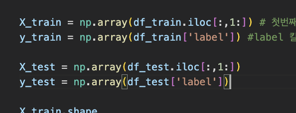 df_train.iloc[:, 1:]으로 첫번째 칼럼 label을 뺀 나머지를 지정해준다. 다시 코드를 실행하니 정상 작동 되었다.