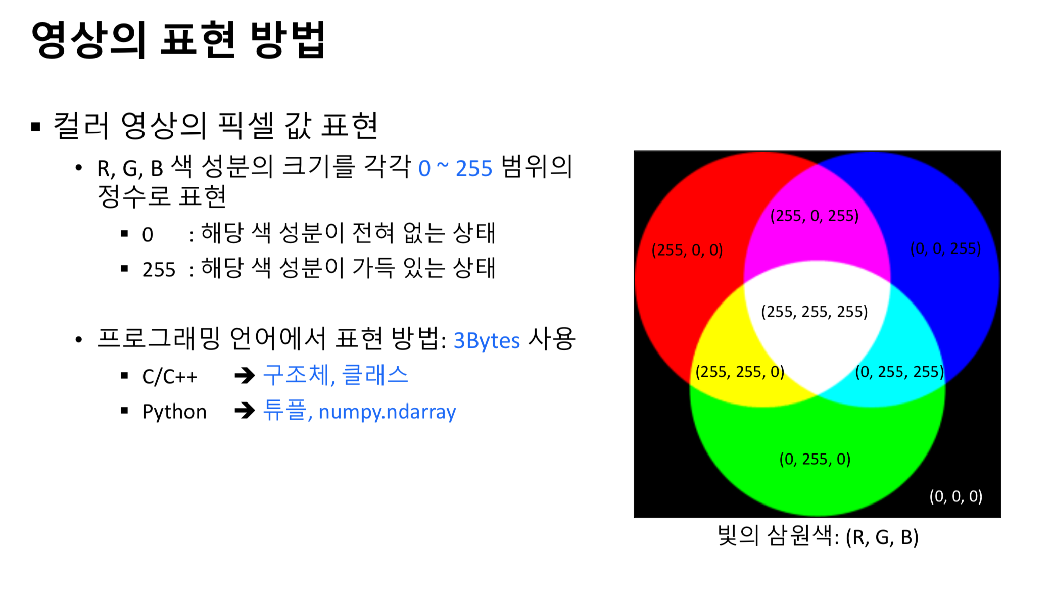 - 픽셀 (pixel) : 영상의 기본 단위, picture element, 화소
