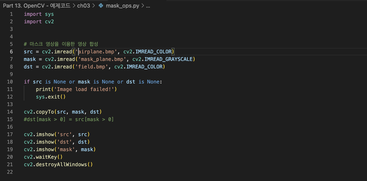 dst[mask > 0] = src[mask > 0]을 사용해도 같은 결과값을 얻을 수 있다.