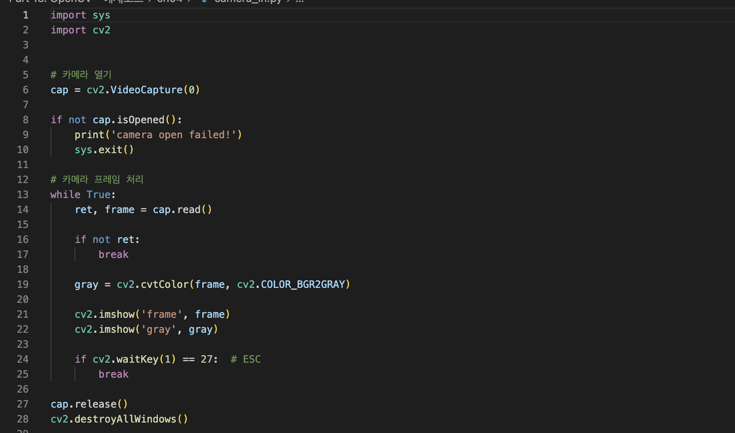 : OpenCV에서는 카메라와 동영상으로부터 프레임(frame, 정지영상 하나)을 받아오는 작업을