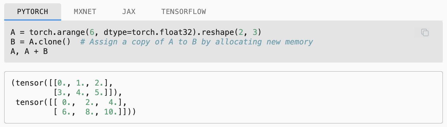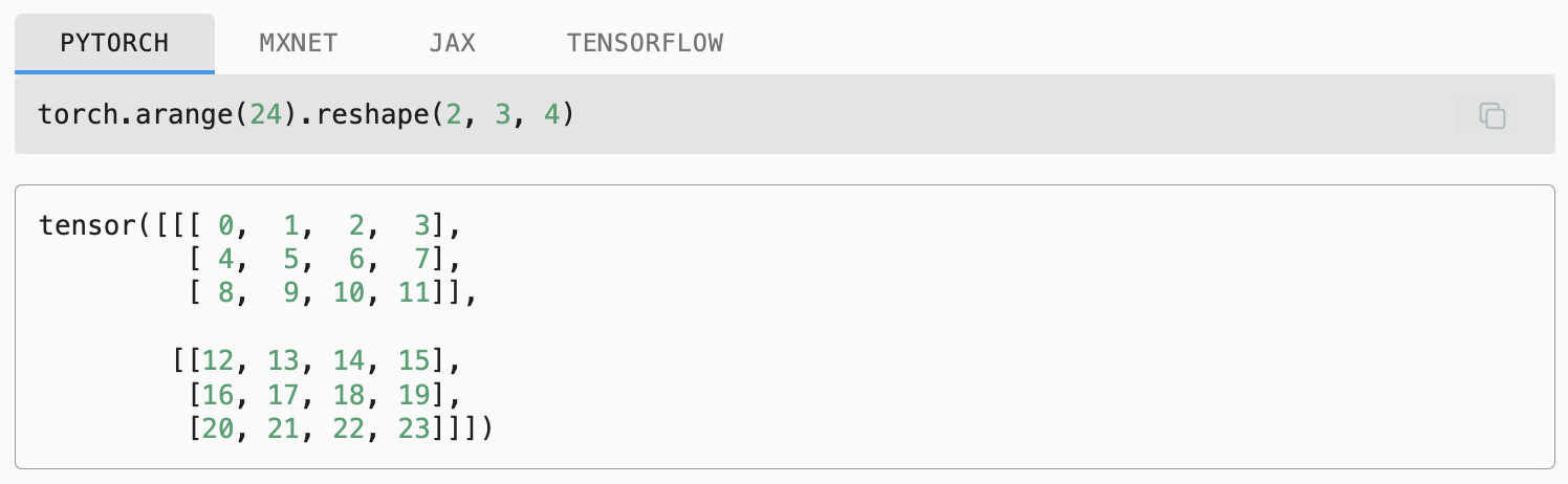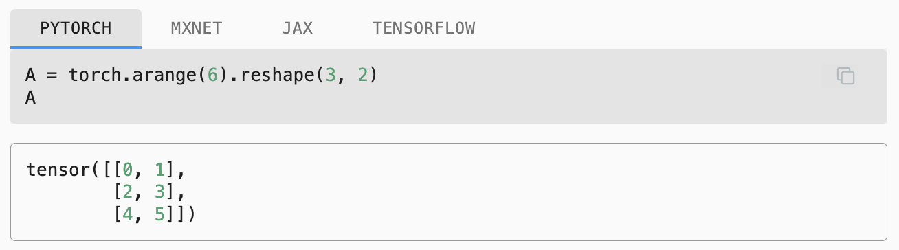 In code, we represent a matrix π ∈ βα΅Λ£βΏ by a 2nd-order tensor with shape (π , π). We can convert any appropriately sized π × π tensor into an π × π matrix by passing the desired shape to reshape: