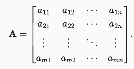 Just as scalars are 0th-order tensors and vectors are 1st-order tensors, matrices are 2nd-order tensors. We denote matrices by bold capital letters (e.g.,π, π, and π), and represent them in code by tensors with two axes. The expression π ∈ βα΅Λ£βΏ indicates that a matrix π contains π × π real-valued scalars, arranged as π rows and π columns. When π=π, we say that a matrix is square. Visually, we can illustrate any matrix as a table. To refer to an individual element, we subscript both the row and column indices, e.g., πα΅’j is the value that belongs to π’s π²α΅Κ° row and πα΅Κ° column: