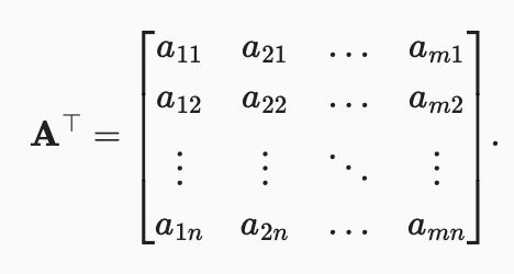Sometimes we want to flip the axes. When we exchange a matrix’s rows and columns, the result is called its transpose. Formally, we signify a matrix π’s transpose by πα΅ and if π= πα΅, then πα΅’π«=πα΅’π« for all π² and π. Thus, the transpose of an π × π matrix is an π × π matrix: