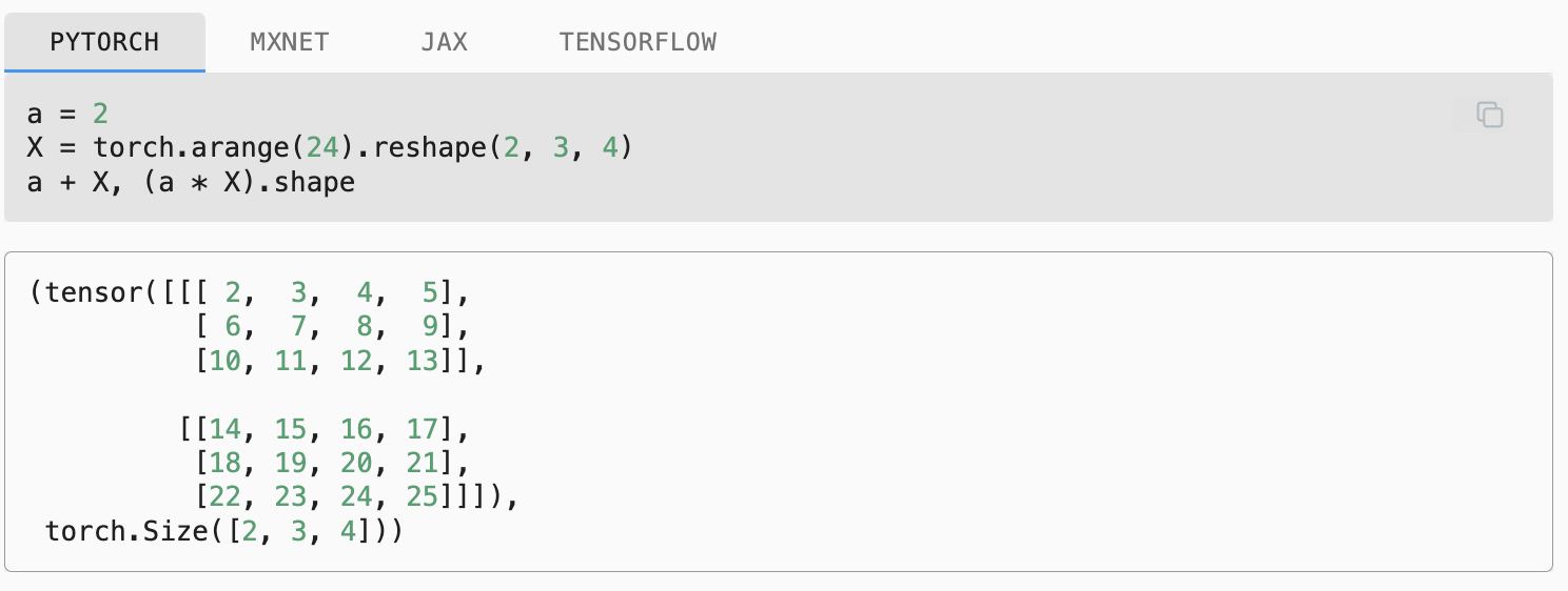 While you can go far in your machine learning journey with only scalars, vectors, and matrices, eventually you may need to work with higher-order tensors. Tensors give us a generic way of describing extensions to πα΅Κ°-order arrays. We call software objects of the tensor class “tensors” precisely because they too can have arbitrary numbers of axes. While it may be confusing to use the word tensor for both the mathematical object and its realization in code, our meaning should usually be clear from context. We denote general tensors by capital letters with a special font face (e.g., π, π, and π) and their indexing mechanism (e.g., πα΅’π«α΅ and [X]β,βα΅’−β,β) follows naturally from that of matrices.