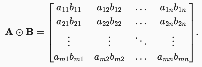 The elementwise product of two matrices is called their Hadamard product (denoted β). We can spell out the entries of the Hadamard product of two matrices π,π ∈ βα΅Λ£βΏ :