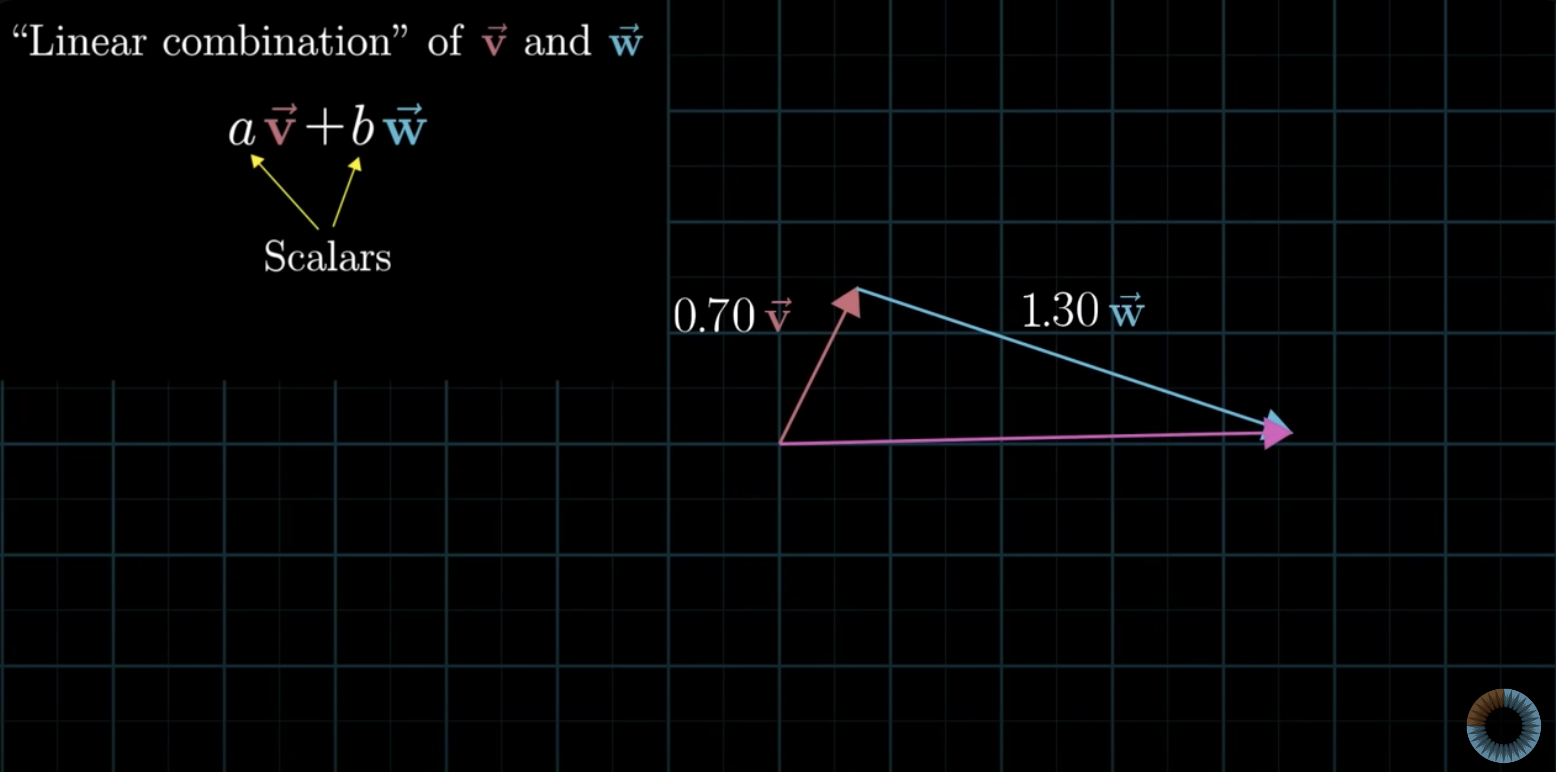 이처럼 두 벡터를 스케일하고 더하여 새 벡터를 얻는 모든 연산을, 두 벡터의 선형결합 이라고 부른다.