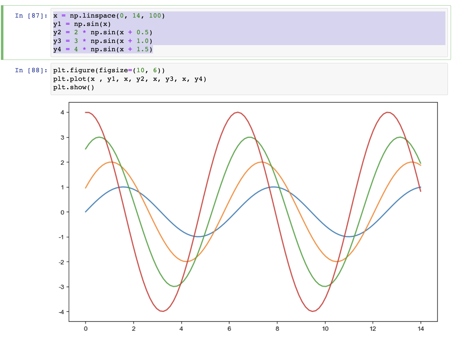 np.linspace(0, 14, 100) # 0부터 14까지 100개의 데이터