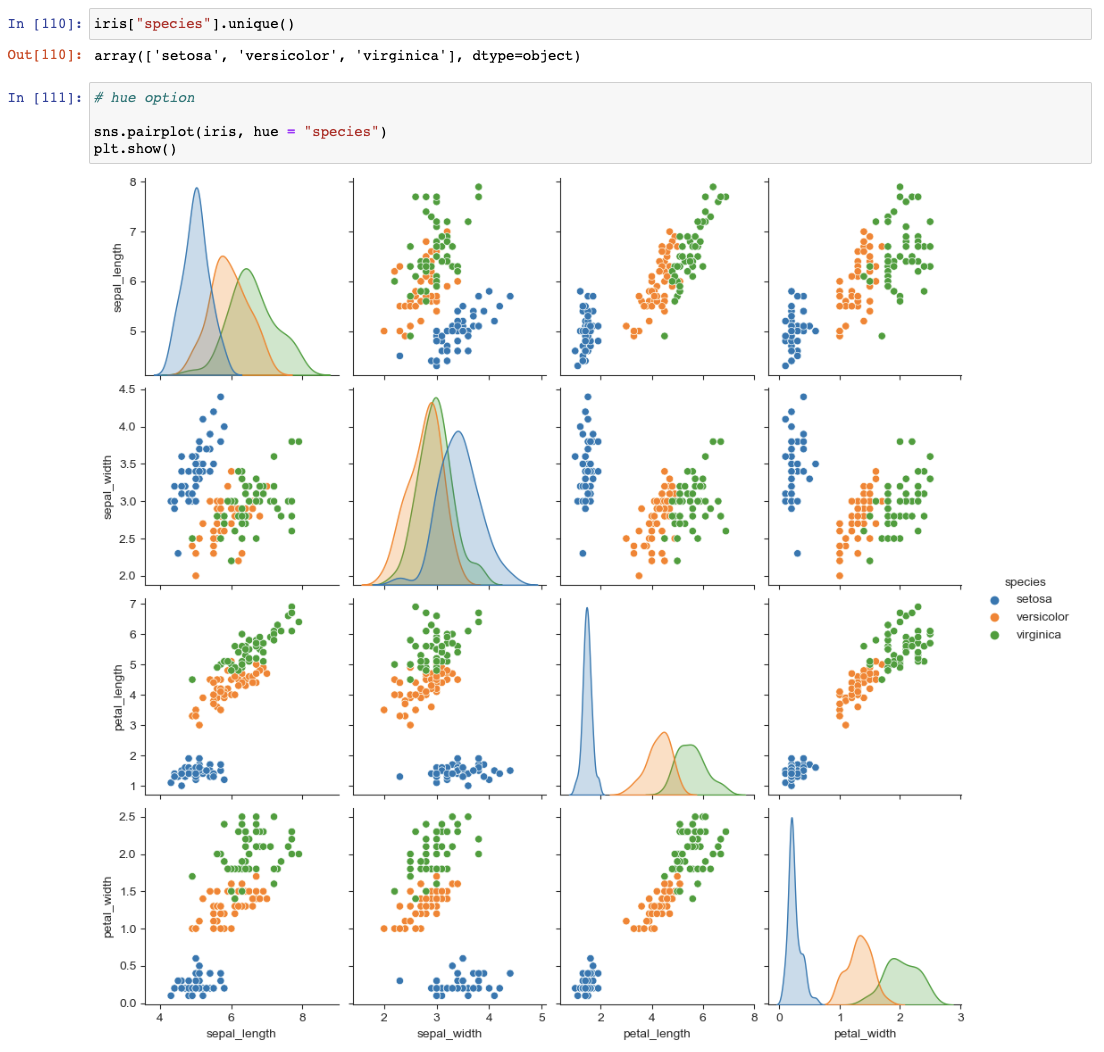 - unique로 species 확인 후 hue option으로 가독성 + 종 나누기