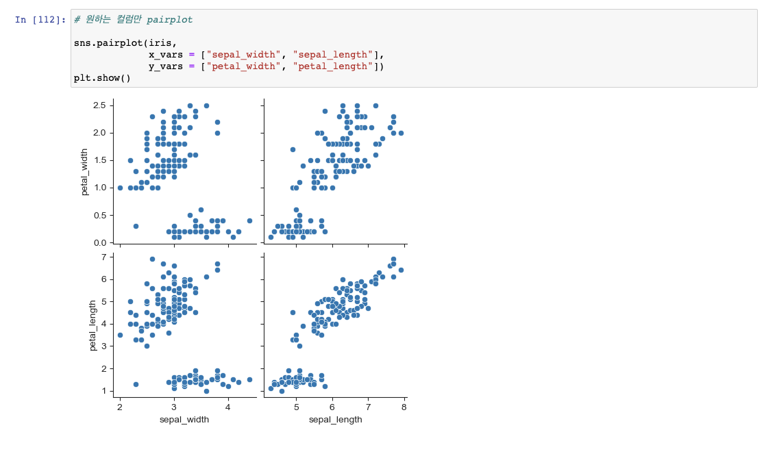 - 원하는 columns만 지정하여 pairplot 생성도 가능