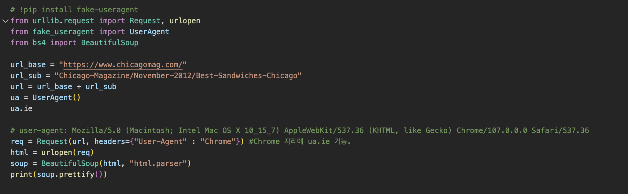 즉, headers는, 우선 하던대로 response = urlopen(url)으로 url을 열어보고 403 오류가 뜬다면 그때 req로 headers 값 지정해주면 된다. 위에서는 간략하게 Chrome으로 적어줬지만, 정석대로 한다면 #주석에 있는 값을 적어주는게 맞다.