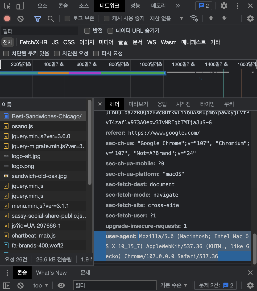 "User-Agents"값은 개발자 도구 -> 네트워크 -> 해당 요청 이름을 누른 뒤 맨 아래로 스크롤하면 있다.