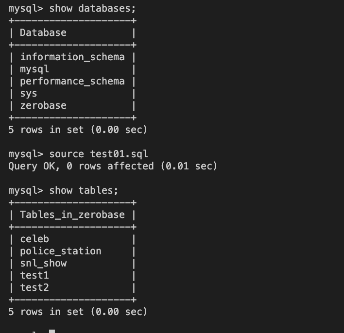 앞서 백업한 zerobase 백업 파일을 zerodb에서 실행하세요.