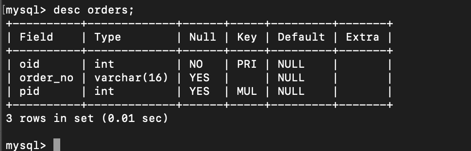 mysql> create table orders