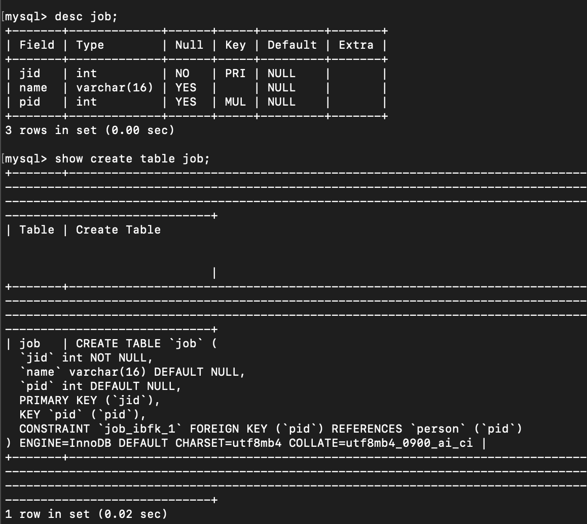 코드 내에서는 constraint를 생략하였지만 show create table job; 확인해보면 생성되어있는 것을 볼 수 있다.