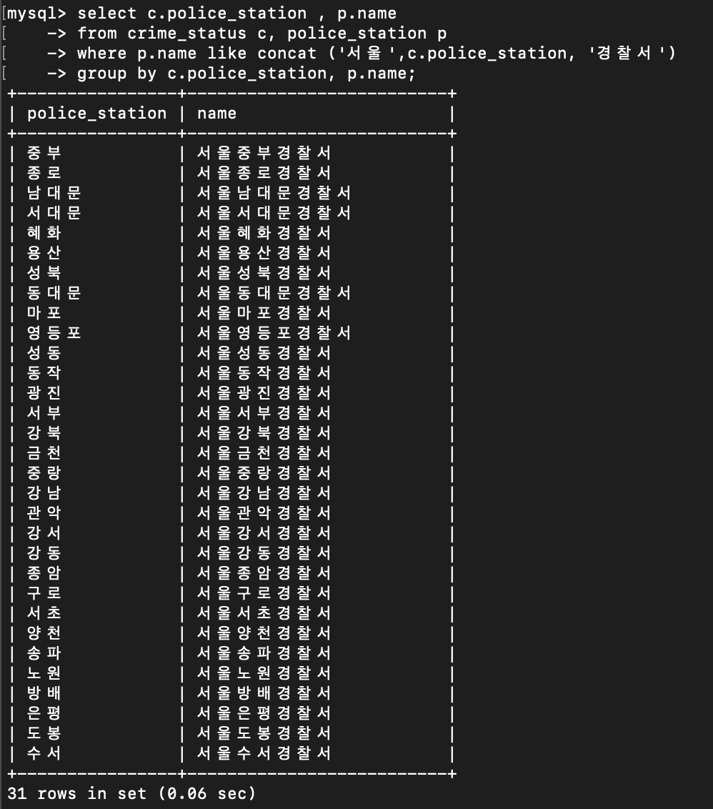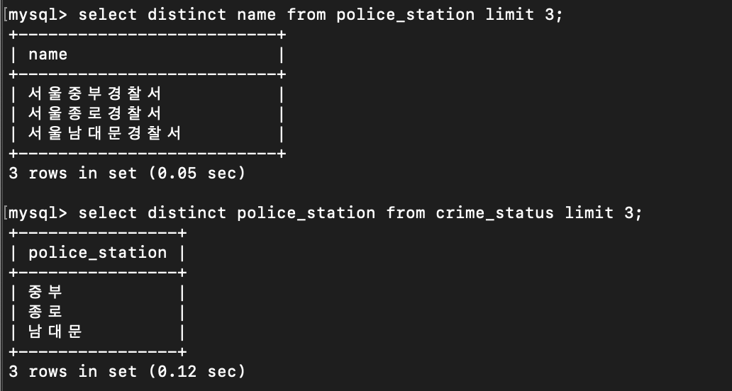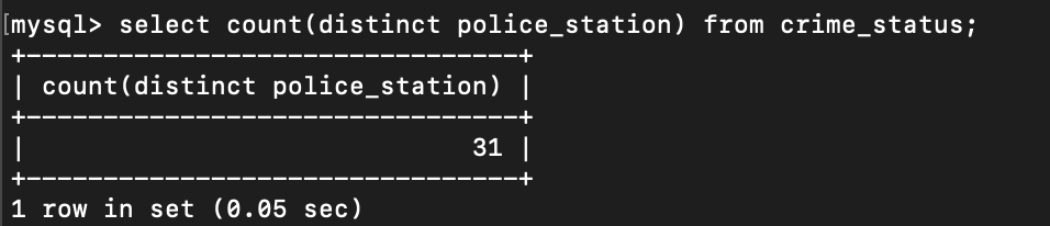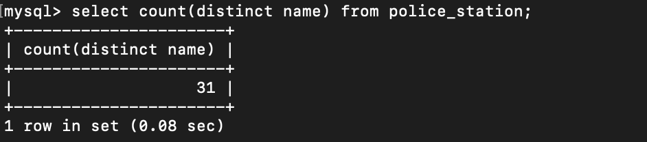 - crime_status의 select count를 확인하는 코드에서 나타나는 police_station은 테이블을 일컫는 것이 아닌, crime_status 내에 있는 칼럼 이름이다.