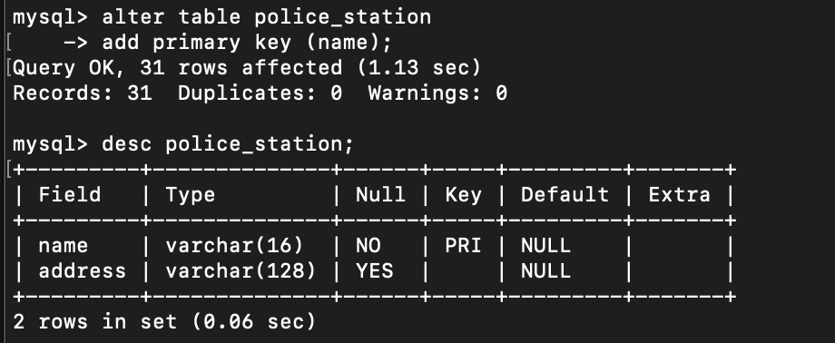 - police_station의 name 칼럼에 primary key를 add 해준다.