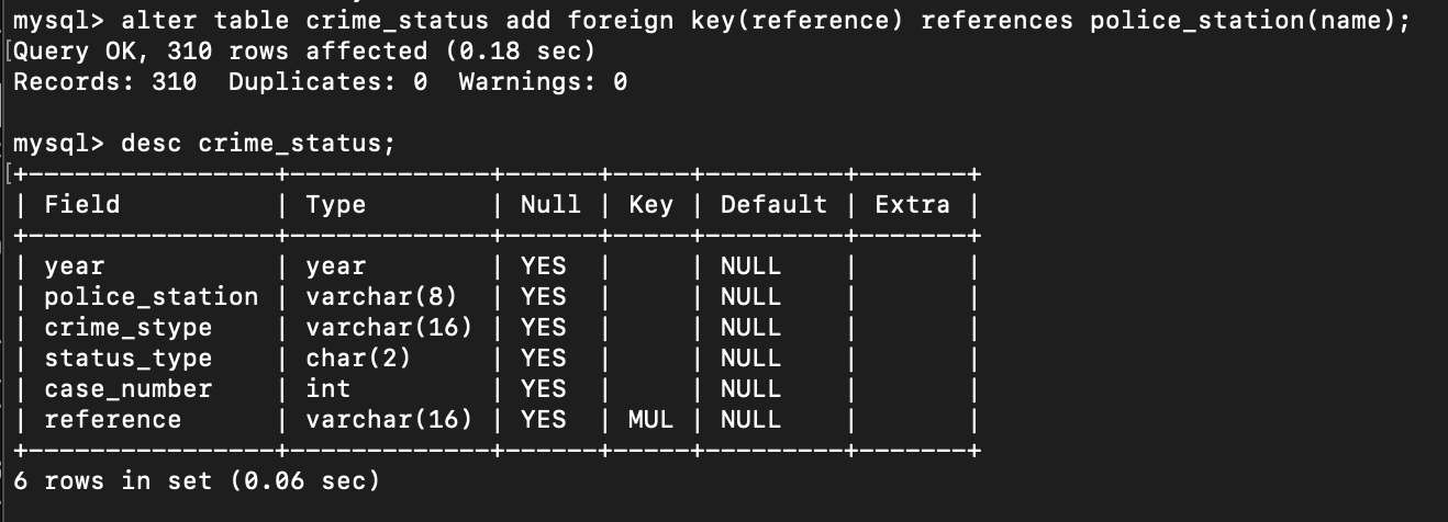 - police_station의 name 칼럼을 참조하여 crime_status의 reference 칼럼에 foreign key를 add한다.