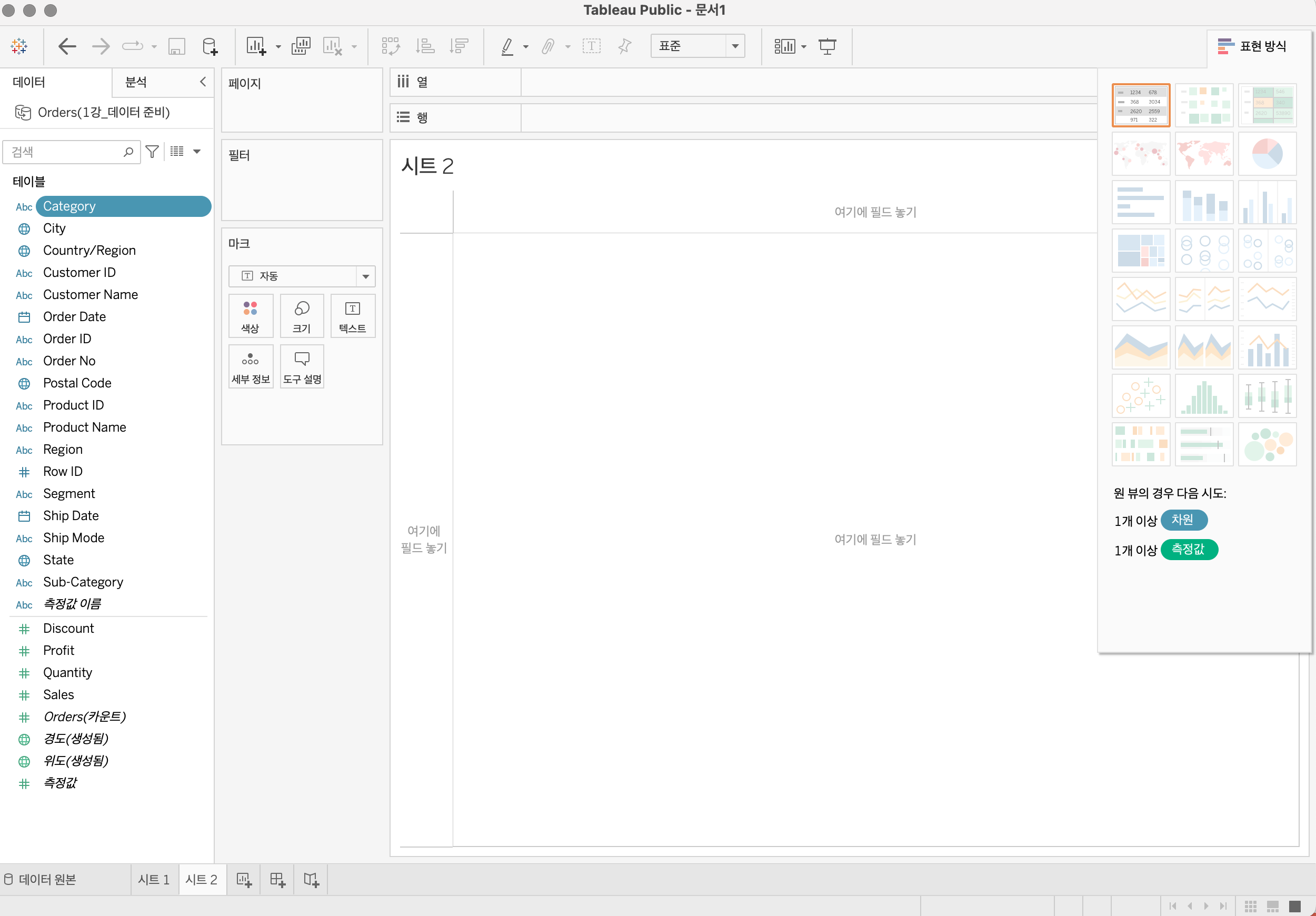 - 파란색 측정값 및 차원은 불연속성이다. 불연속형 값은 유한한 범위로 취급한다. 일반적으로 불연속형 필드는 뷰에 머리글을 추가한다.