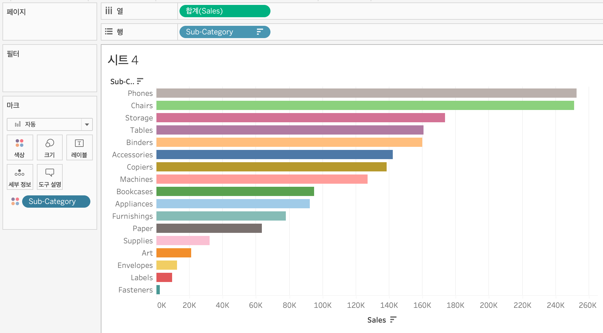 열과 행에 올려놓은 필드들을 command를 누른채로 drag하여 마크 창에 옮겨놓으면 자동적으로 색상이 표현된다.