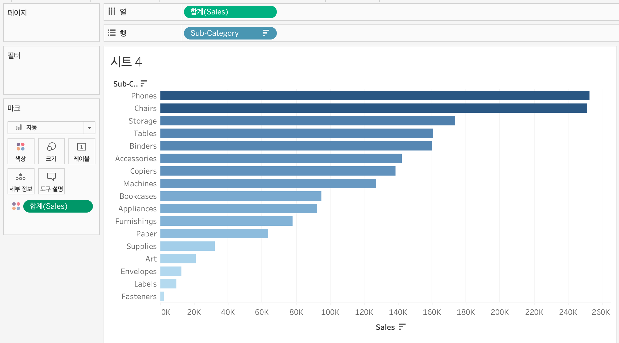Tableau는 필드가 불연속성(파란색)인지, 연속성(녹색)인지에 따라 뷰에서 데이터가 다르게 표시된다.