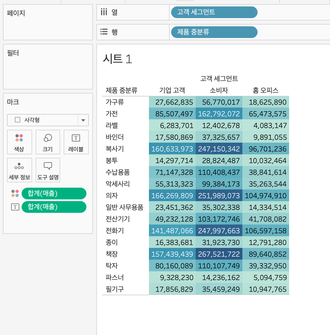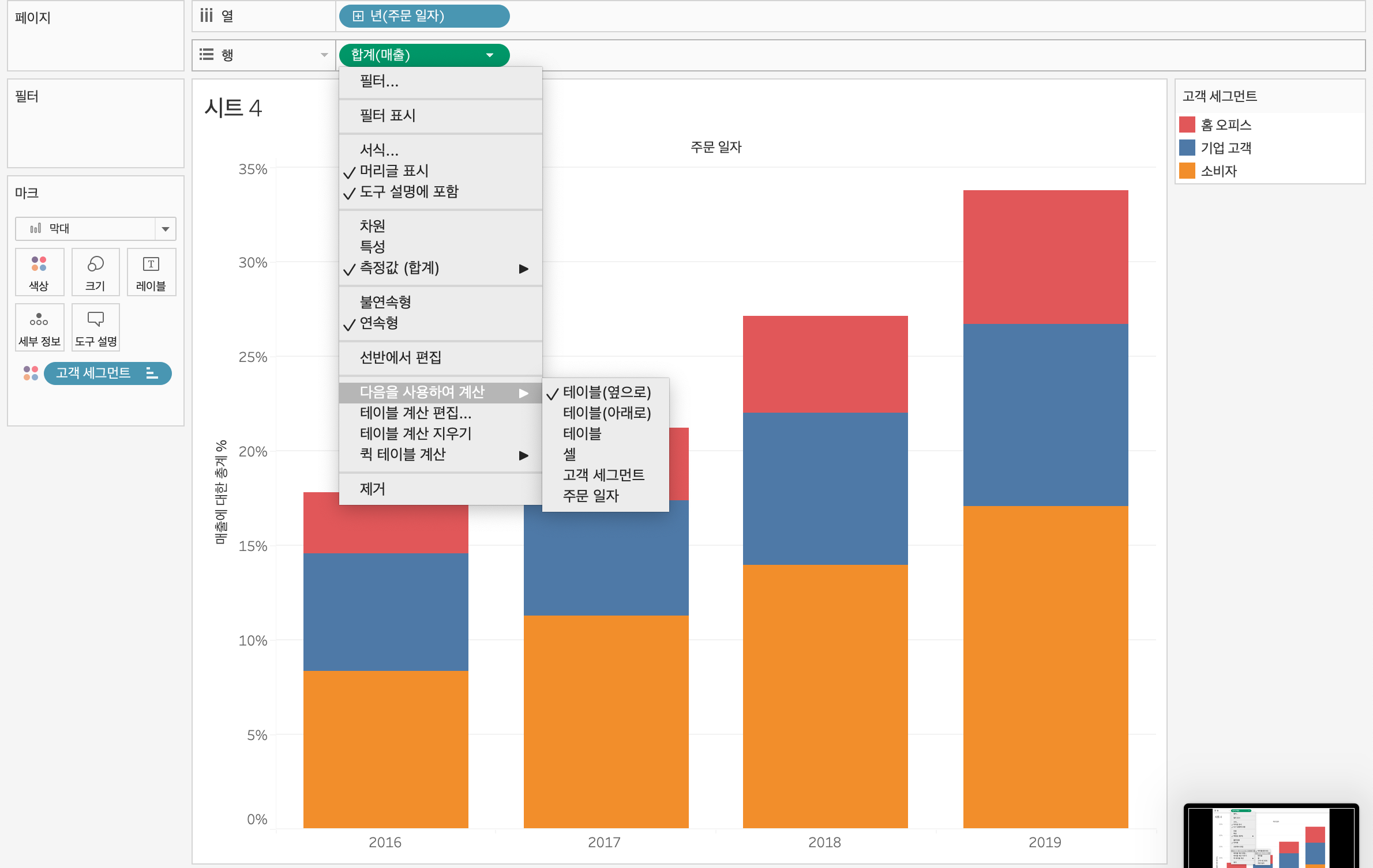 -> 테이블 (아래로) 변경 -> 각 연도별 세그먼트 비중 합 100