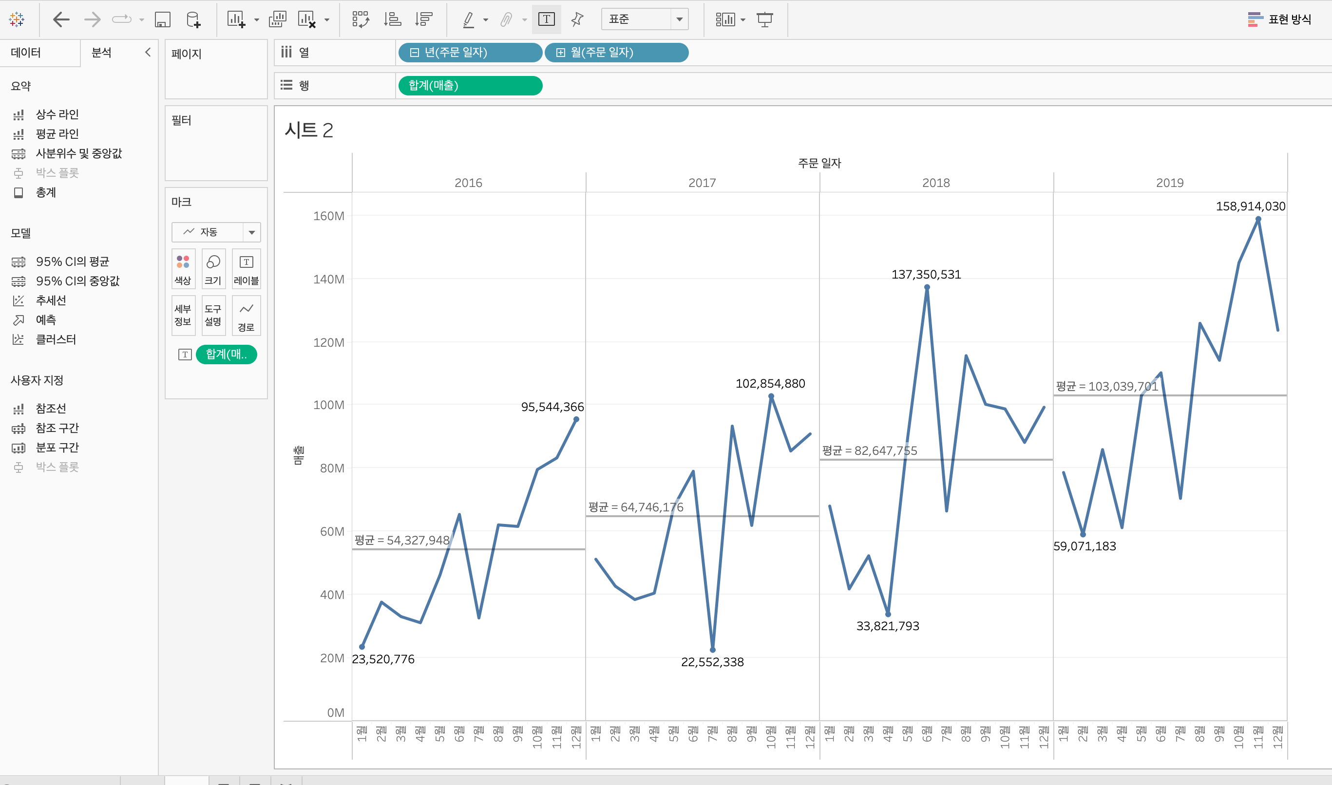 분석 -> 평균라인 드래그해서 시트에 가져오면 테이블, 패널, 셀 라인 선택 가능 -> 패널 선택 -> 평균 선 클릭