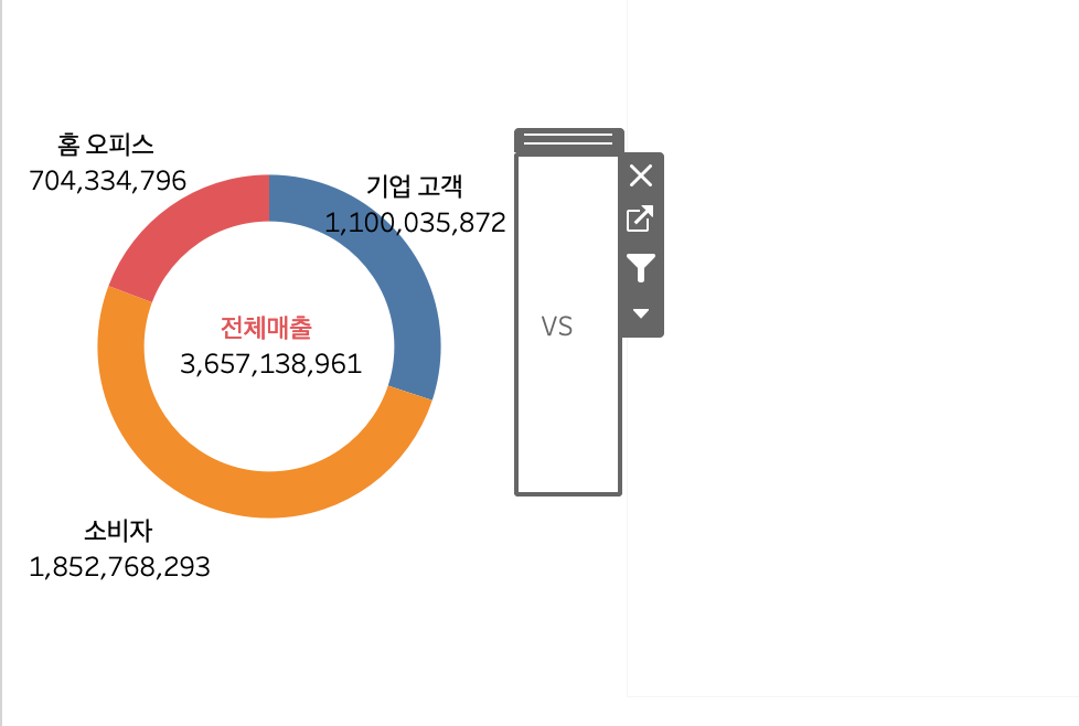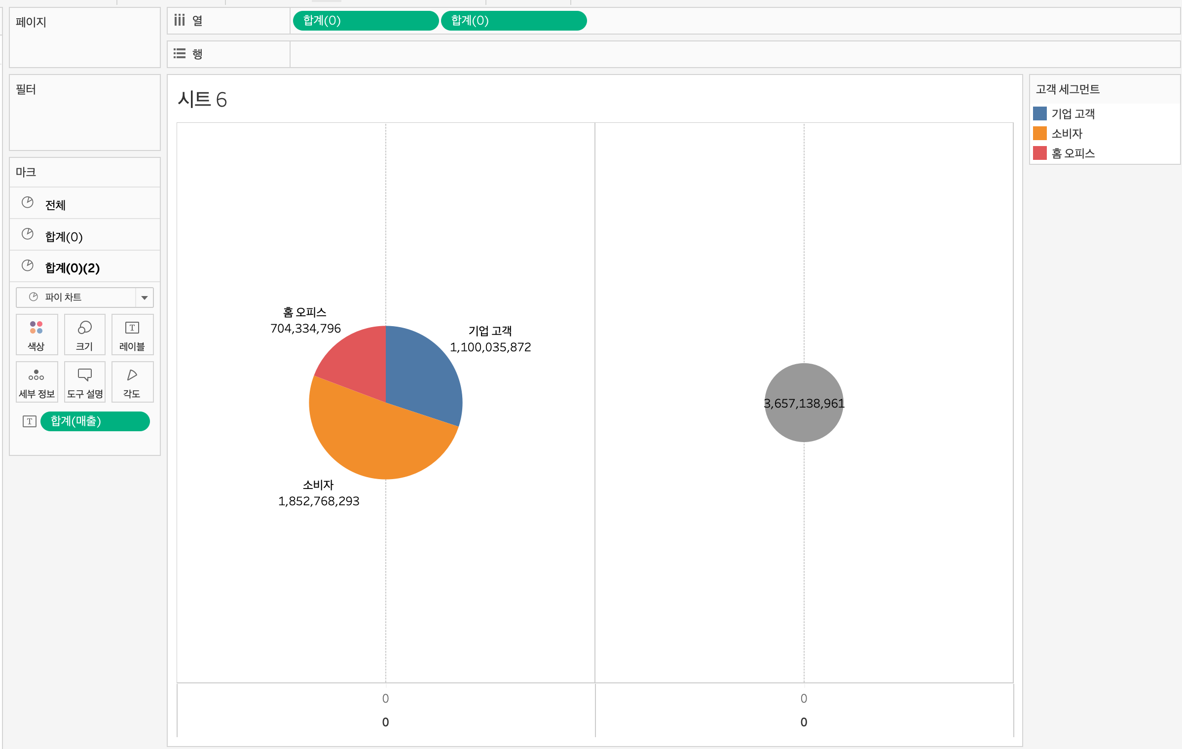 레이블에 합계(매출), 고객세그먼트 / 각도에 합계(매출) / 색상에 고객세그먼트 마크넣은 차트 2개를 만든 뒤,