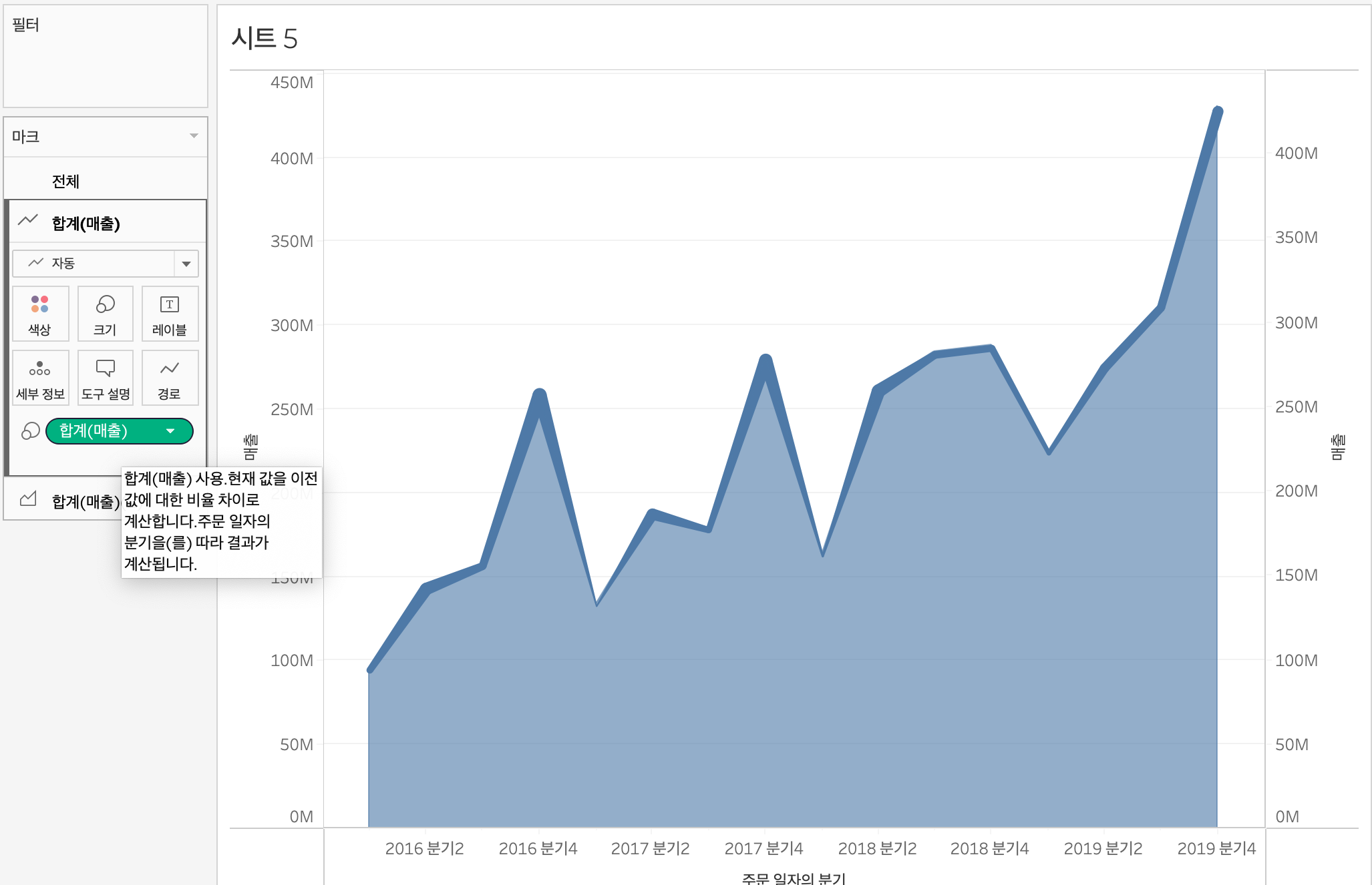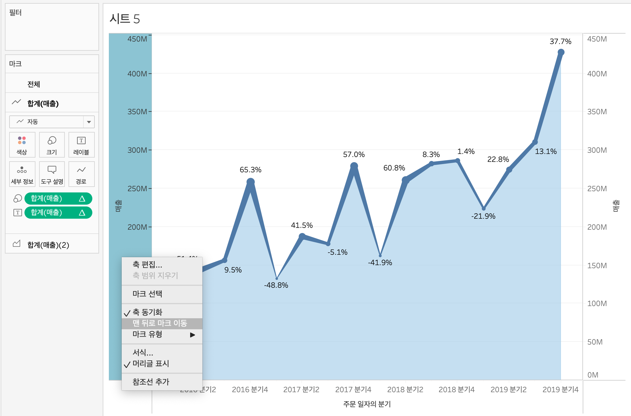 라인차트 강조 위해 매출 드래그, 크기에 올려놓기 -> 매출 규모의 크기를 알고싶던게 아니라, 전분기 대비 성장율이 궁금했기에 매출 우클릭