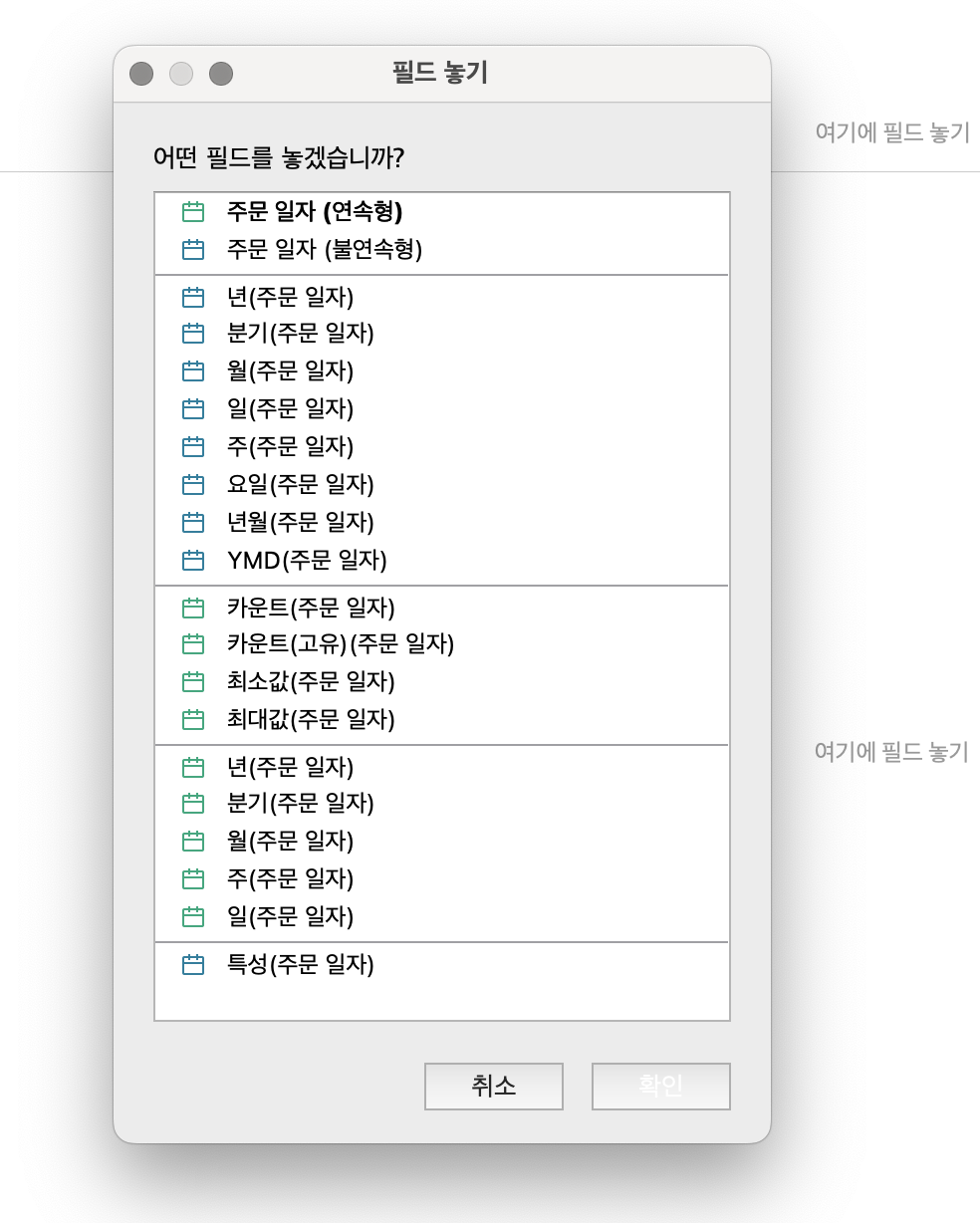 option key를 누른 상태로 주문일자 테이블을 페이지 삽입 -> 초록색 연속형 분기(주문일자)선택
