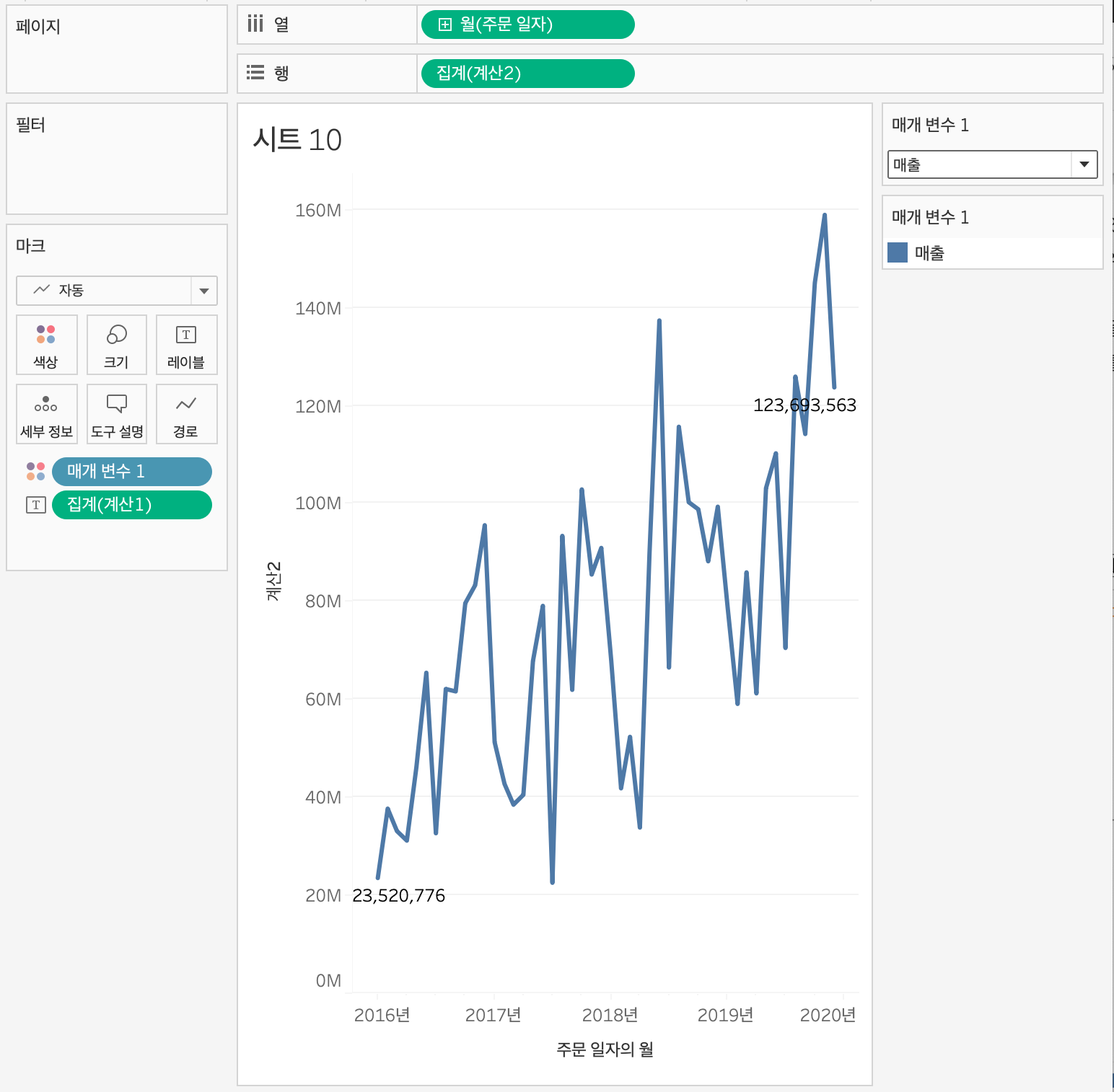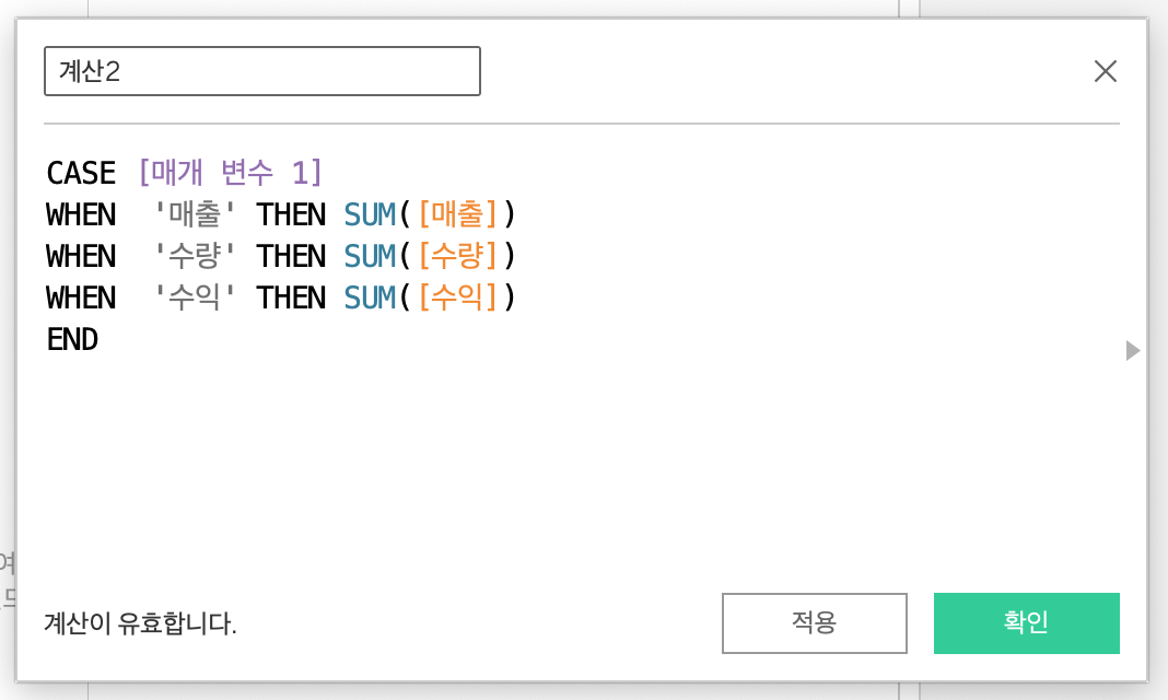 해당 CASE 함수의 내용은, 예를 들면, 이 매개변수에서 매출을 선택할 경우 매출의 합계를 표시해주라는 표시이다.