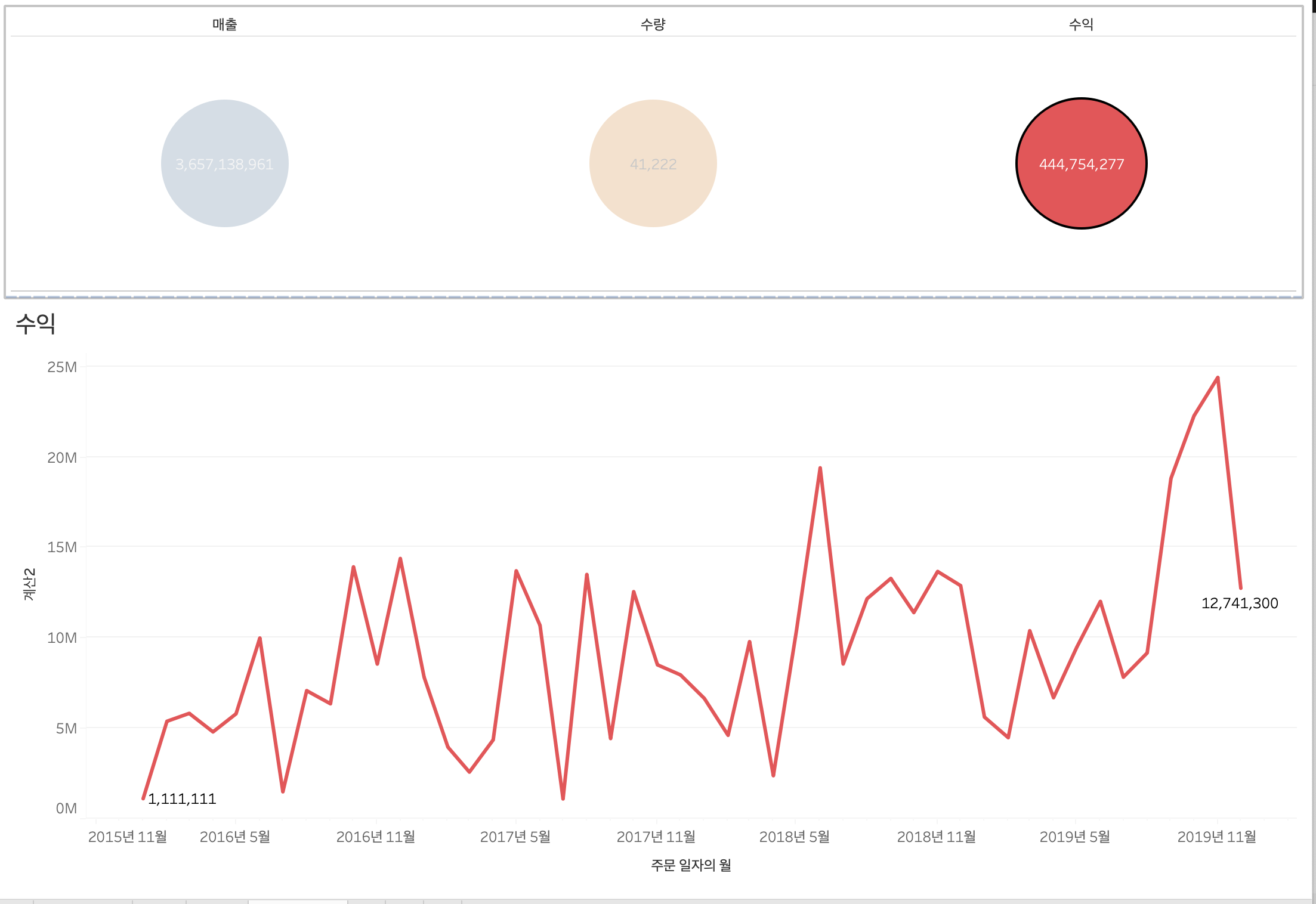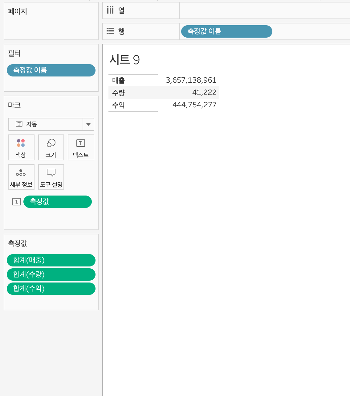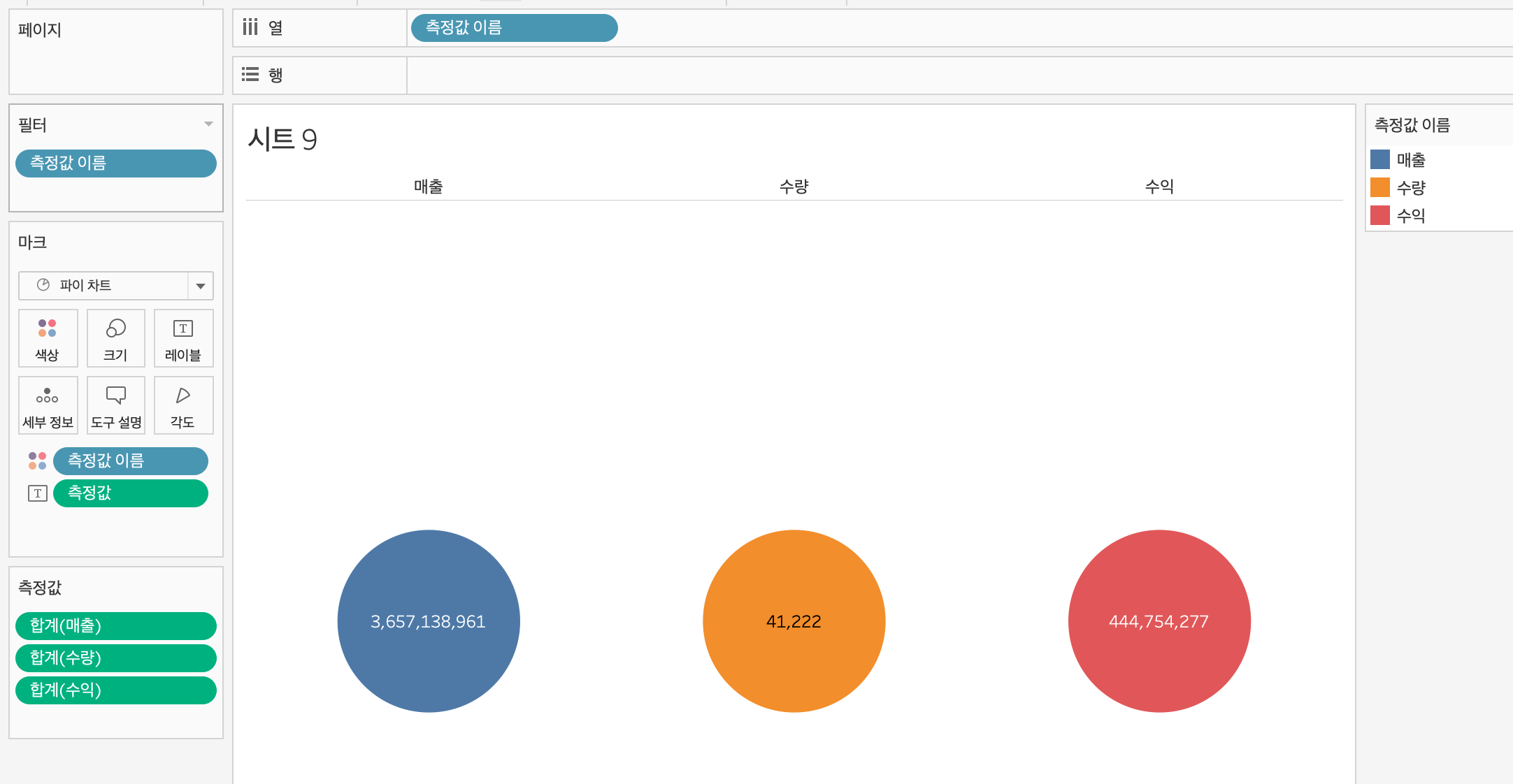 매출, 수량, 수익을 한번에 시트9 안의 뷰 화면에 넣어준 뒤 파이차트로 변경한다.