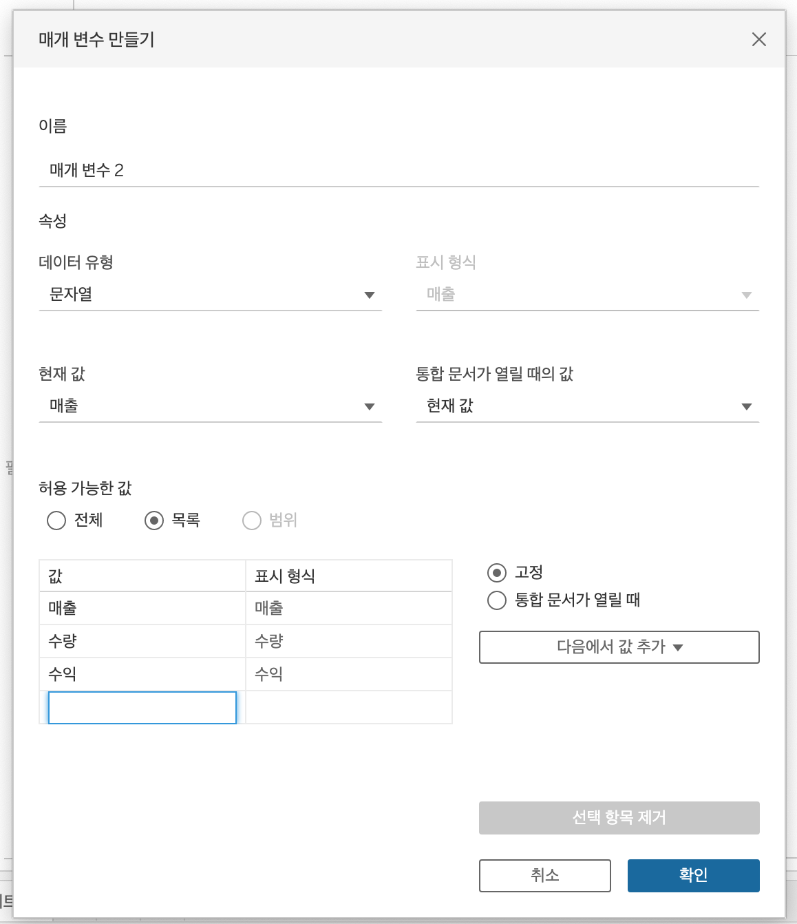 매개 변수를 만들어준다. 데이터 유형은 문자열로, 허용가능 값은 목록으로 지정하여 원하는 리스트를 작성해준다.