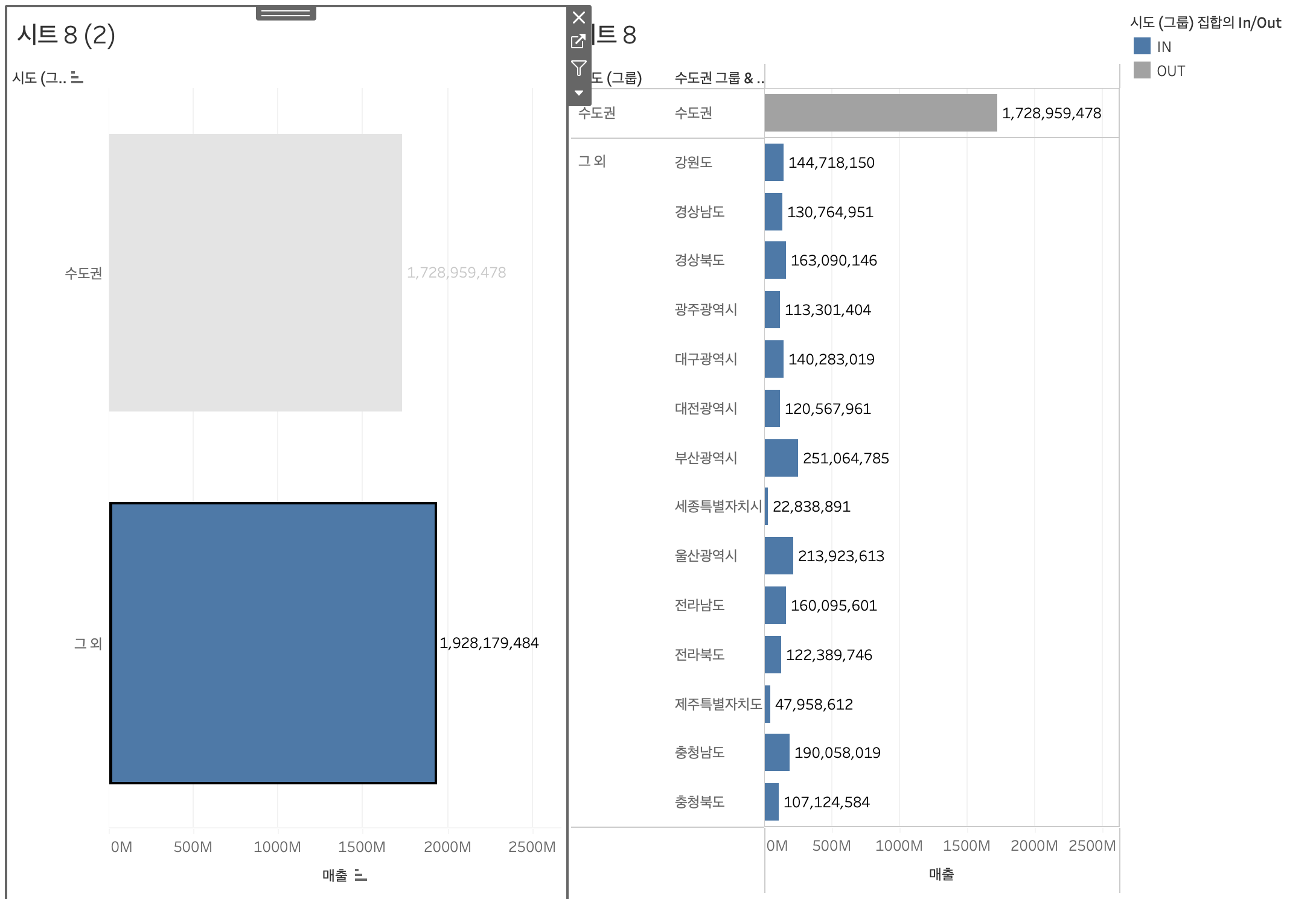 => 마우스 클릭으로 수도권 / 그 외 선택하게 되면 , 선택된 동작은 in / 나머지는 out으로 동적인 움직임 확인 할 수 있다.