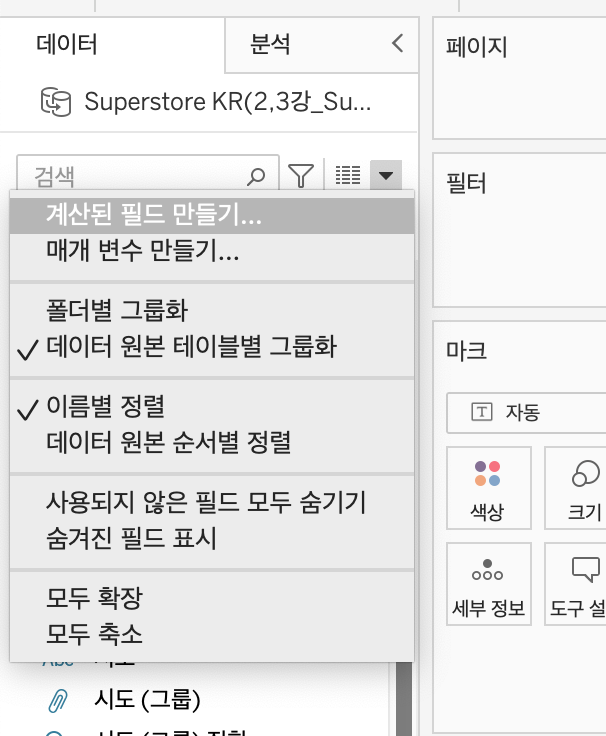 계산 필드를 행에 올려주고 주문일자를 option키를 누른채 열에 올려준다. 연속된 주문일자를 선택한다.