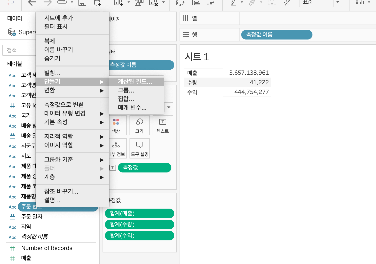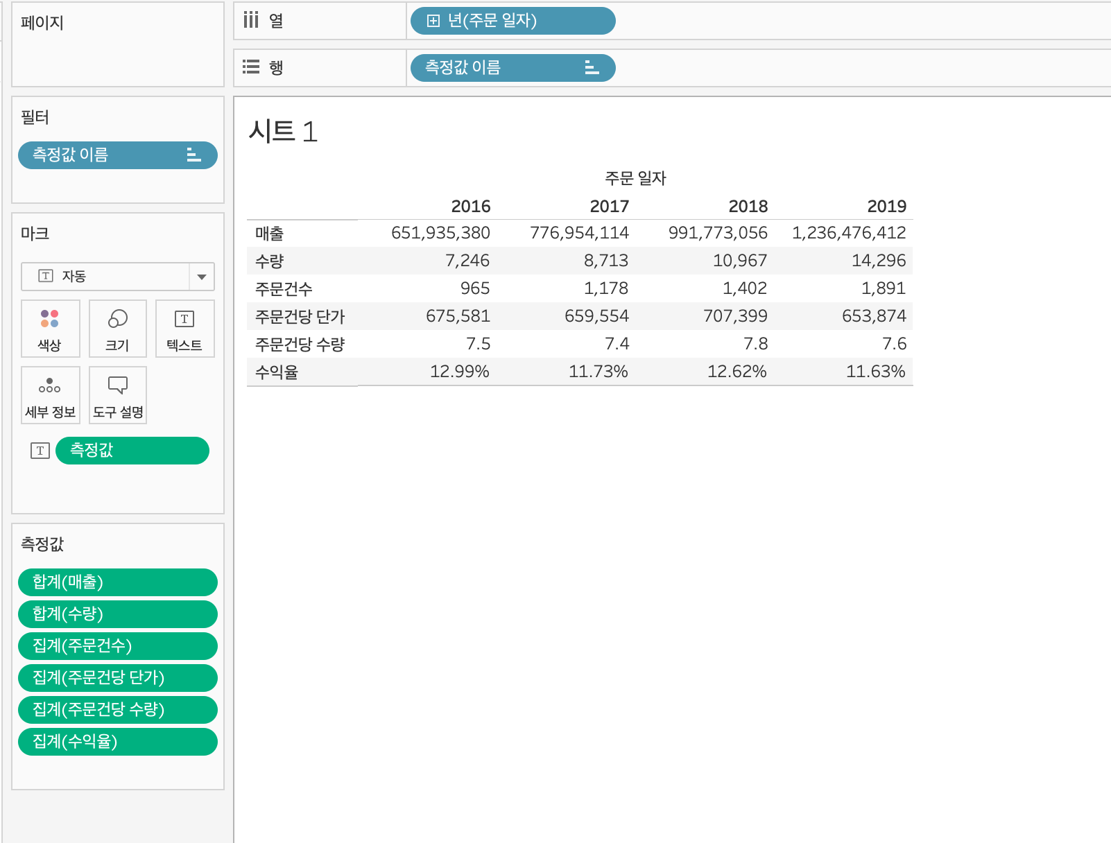 매출은 합계sum을 가져와주고 주문건수는 그렇지 않은 이유는, countd로 이미 집계가 되어있기 때문이다.