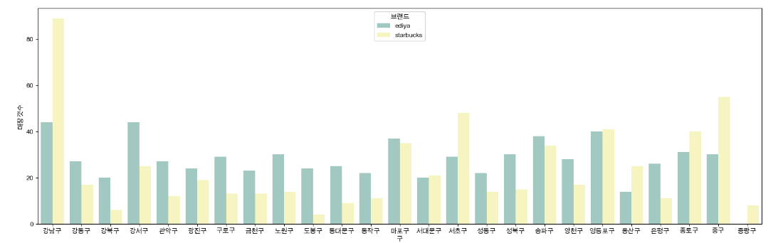- 스타벅스 매장이 있는 곳에 이디야가 위치한다면, 두 브랜드의 매장 갯수는 구별로 편차가 적어야 한다고 생각한다.